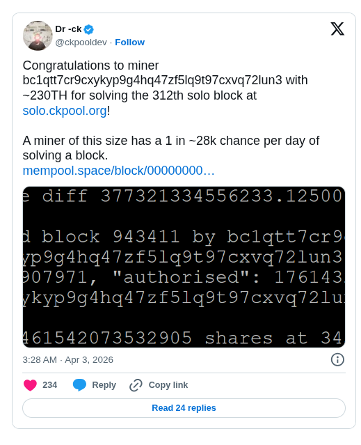 Con Kolivas, the developer behind CKpool, shared that a solo miner with just 230 TH/s managed to beat steep odds to successfully mine a Bitcoin block, the mining setup represented roughly 0.00002% of Bitcoin’s total network hashrate, estimated at approximately 1 zettahash per second (ZH/s) as of April 2. According to CKpool developer Con Kolivas, a miner with this capacity faces approximately a 1-in-28,000 chance of solving a block on any given day.