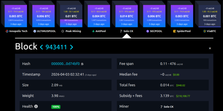 A small solo Bitcoin miner successfully mined block 943411 on Thursday, earning the full block reward of approximately $210,000. The total reward amounted to 3.139 BTC, consisting of a 3.125 BTC block subsidy and 0.014 BTC in transaction fees, valued at around $937. The miner operated through solo.ckpool.org, a solo mining pool that allows participants to retain full rewards while charging a 2% fee. The pool confirmed the achievement, identifying the miner by wallet address and noting the setup’s approximate hashrate of 230 terahashes per second (TH/s).
