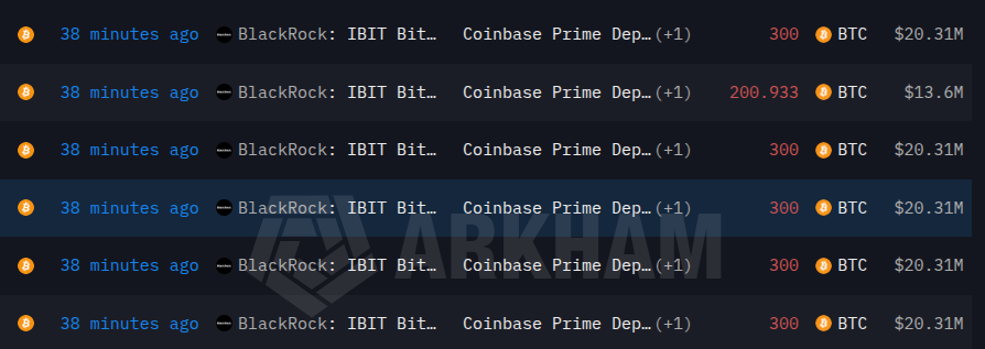 In total, BlackRock moved 1,700.933 BTC, with an estimated value of $115 million. The transfers include multiple batches of 300 BTC, along with one transfer of 200.933 BTC.