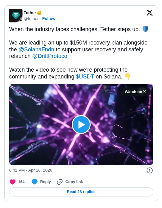 The funding is structured to support user recovery efforts and enable the relaunch of Drift as a USDT-based perpetual futures exchange on Solana. The platform previously used Circle’s USDC as its settlement layer. The rescue package combines a revenue-linked credit facility, ecosystem grants, and loans to market makers. A portion of trading revenue, along with committed capital, will be allocated to a recovery pool designed to cover approximately $295 million in user losses over time.